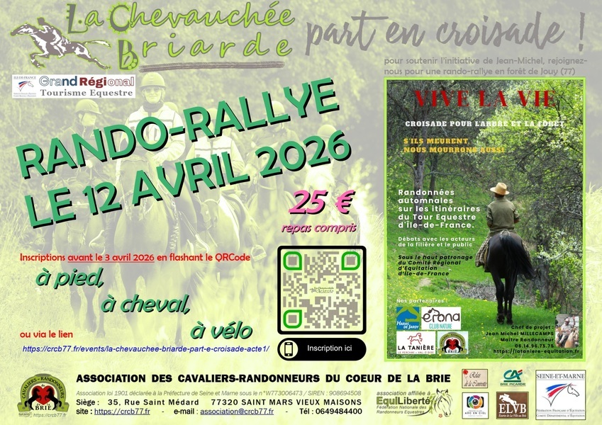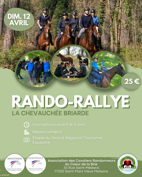 Participez à cette étape du Grand Régional organisée par l’Association des Cavaliers Randonneurs du Cœur de la Brie ! Inscrivez-vous avant le 3 avril 2026 en flashant le QR code sur l’affiche ou via le lien d’inscription.